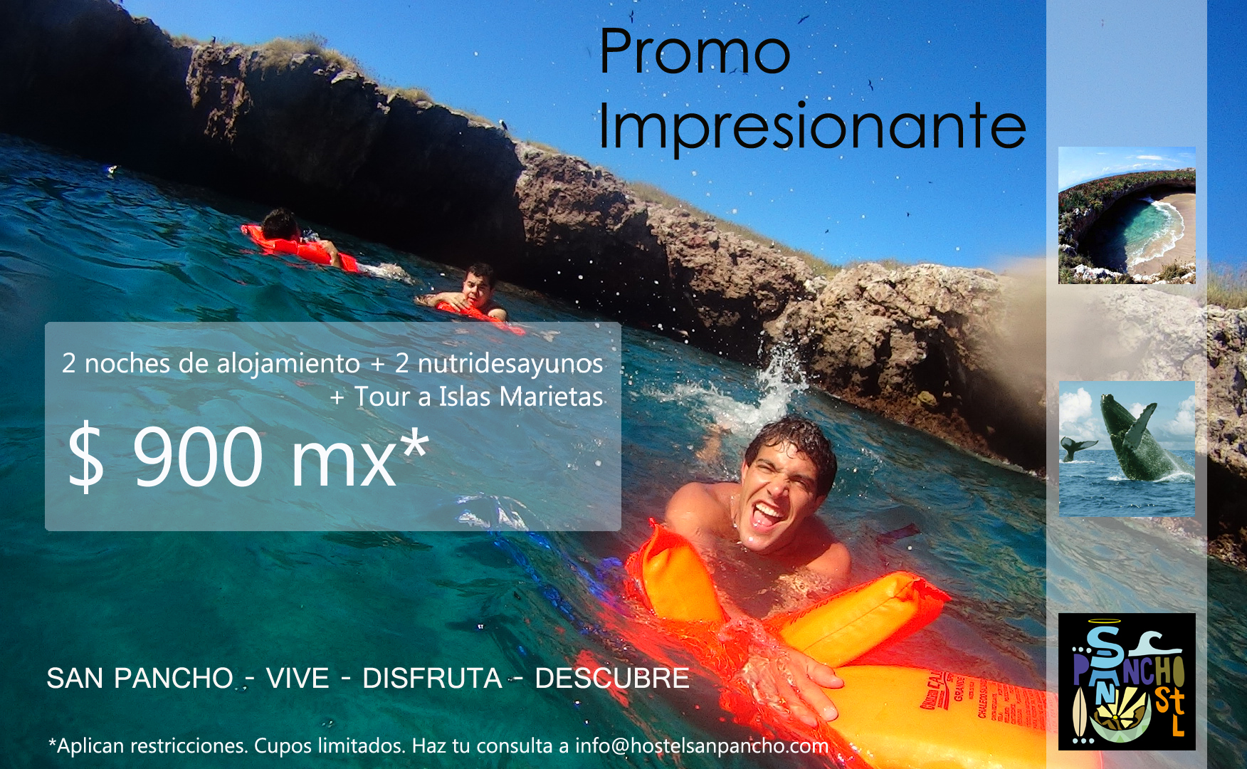 Super promo 2 noches de alojamiento en hostal San Pancho + 2 nutridesayunos + mágico Tour a Islas Marietas, todo a sólo $900 MX.